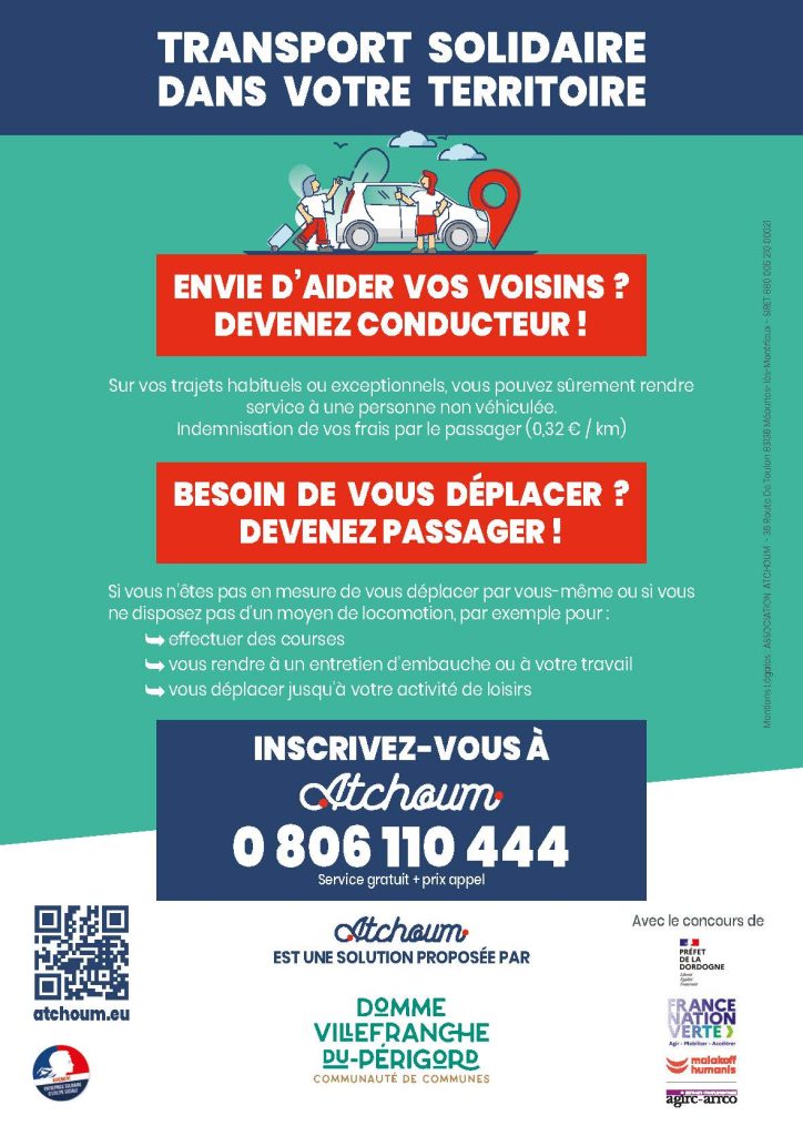 ATCHOUM est un service de covoiturage et de transport solidaire proposé par la communauté de communes Domme – Villefranche-du-Périgord, et déployé dans les 23 communes du territoire.